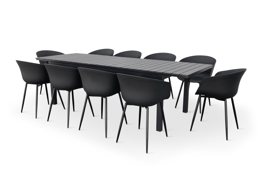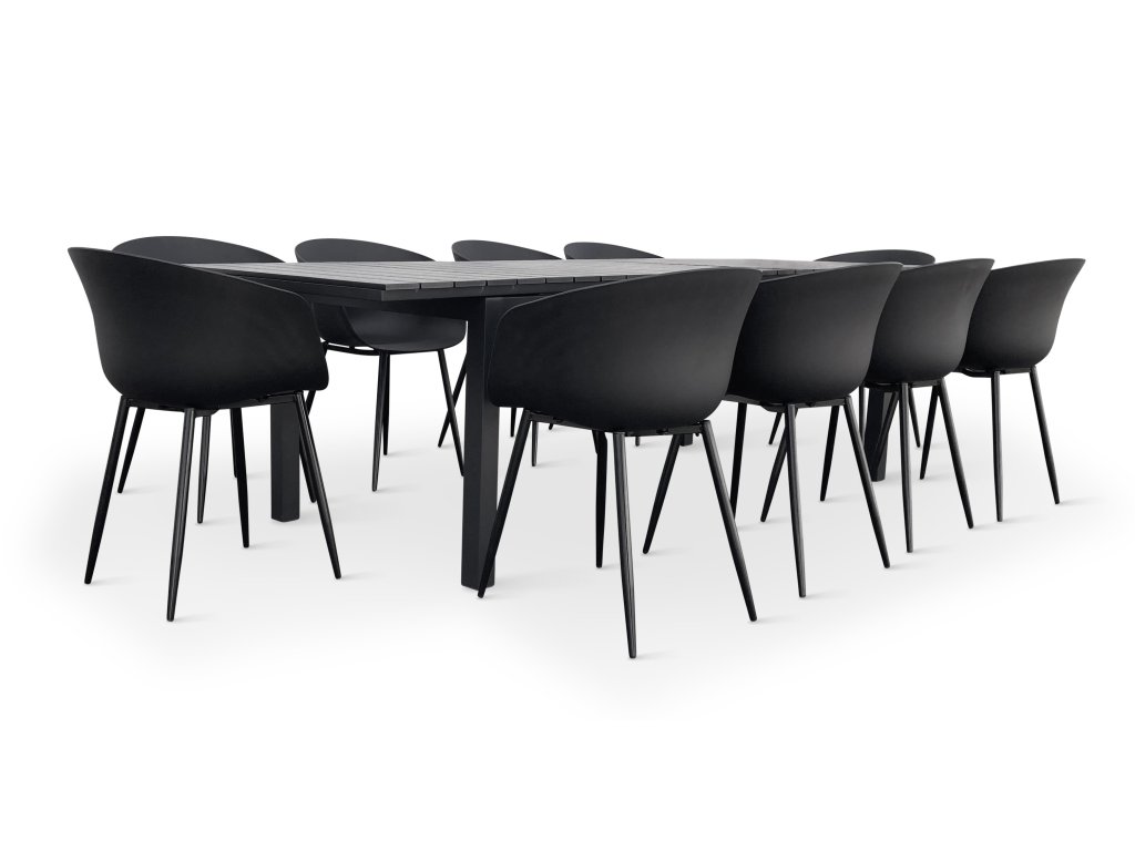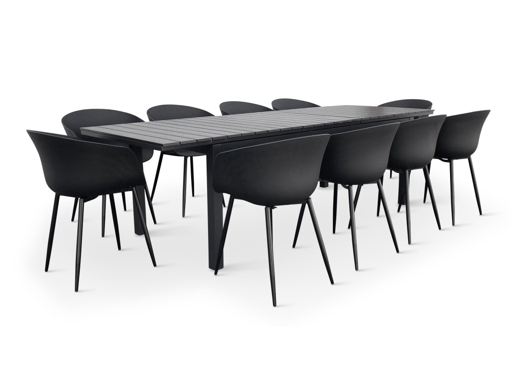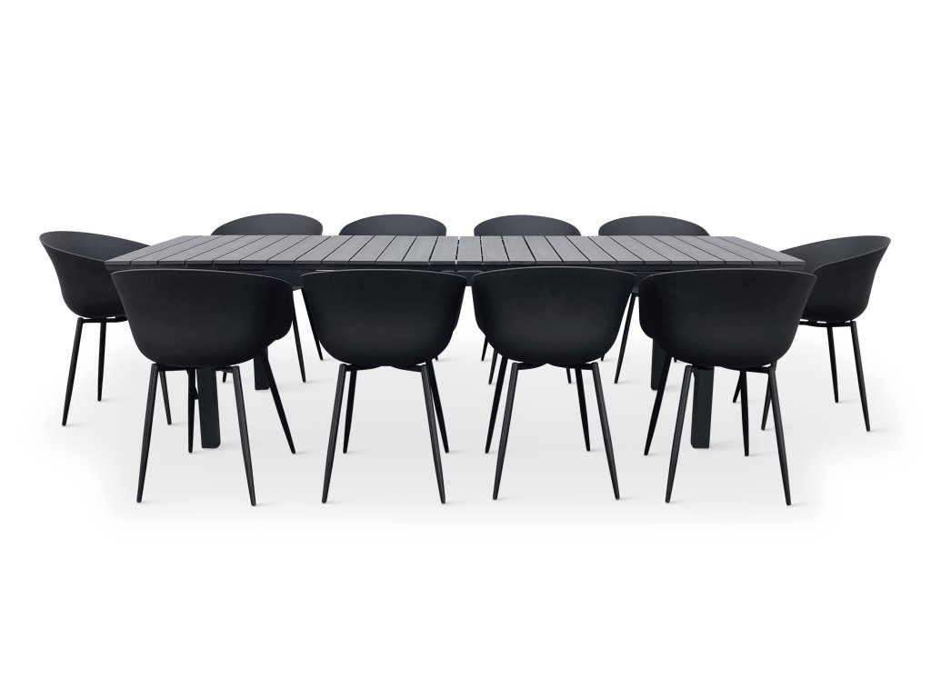 Moderní zahradní jídelní sestava z kovu pro 10 osob. Sestavu tvoří Rozkládací zahradní stůl GRANDE LUNGO XXL a 10x Moderní židle na zahradu RIKKE.