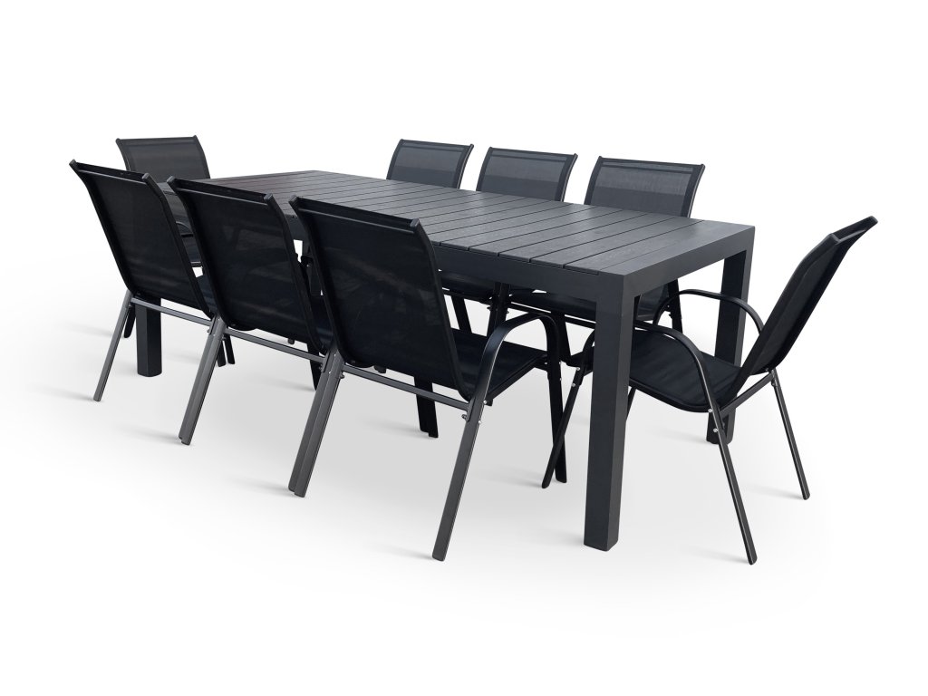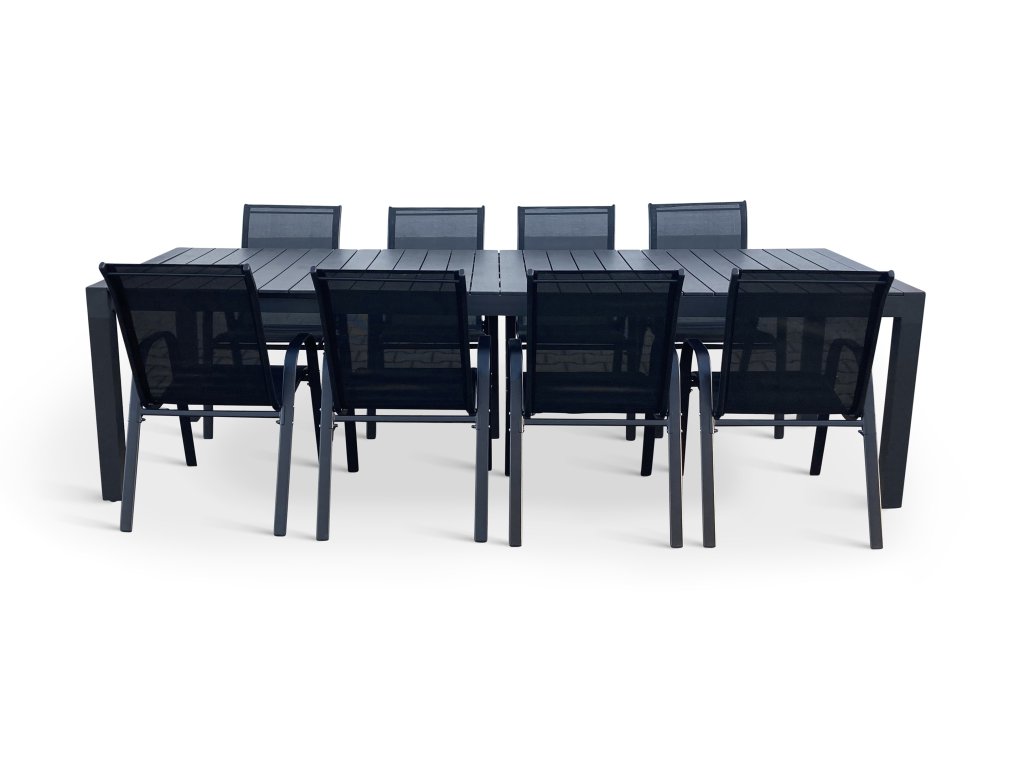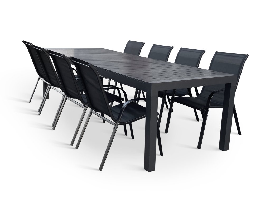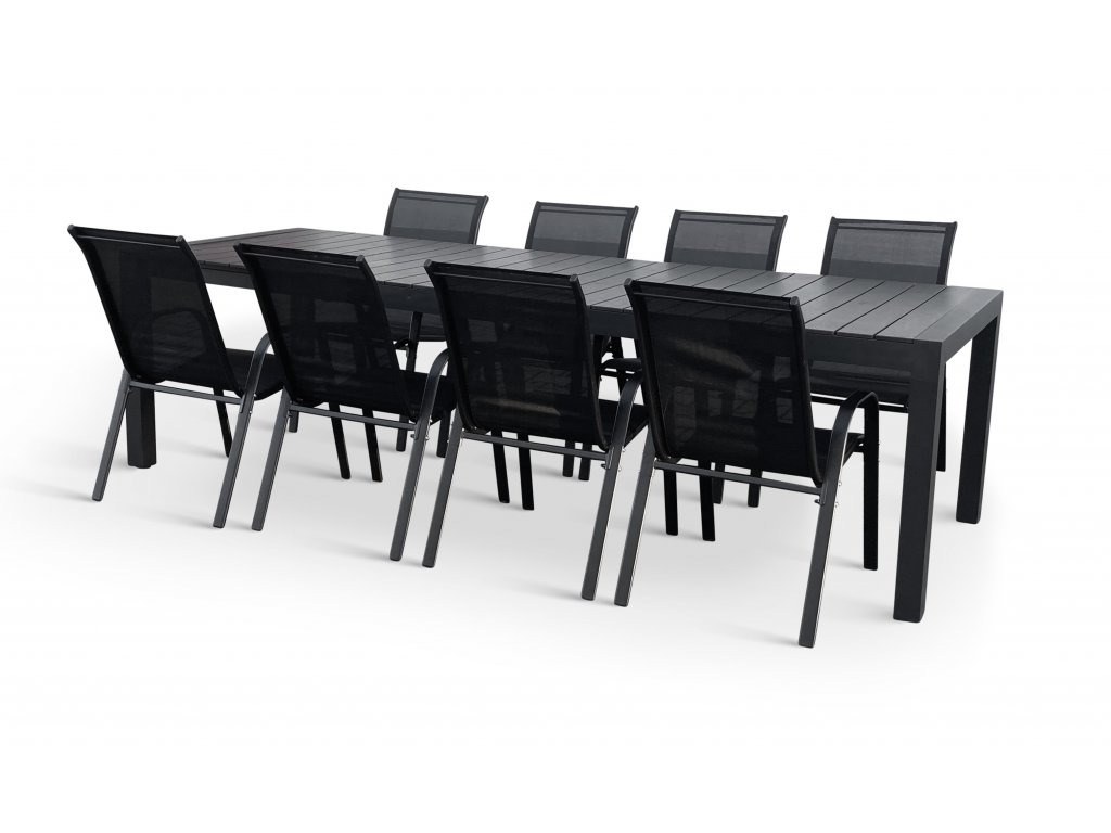 Velká zahradní jídelní sestava z kovu pro 8 osob. Sestavu tvoří Rozkládací masivní stůl GRANDE PASTO XXL a 8x Zahradní židle RAMADA černá.
