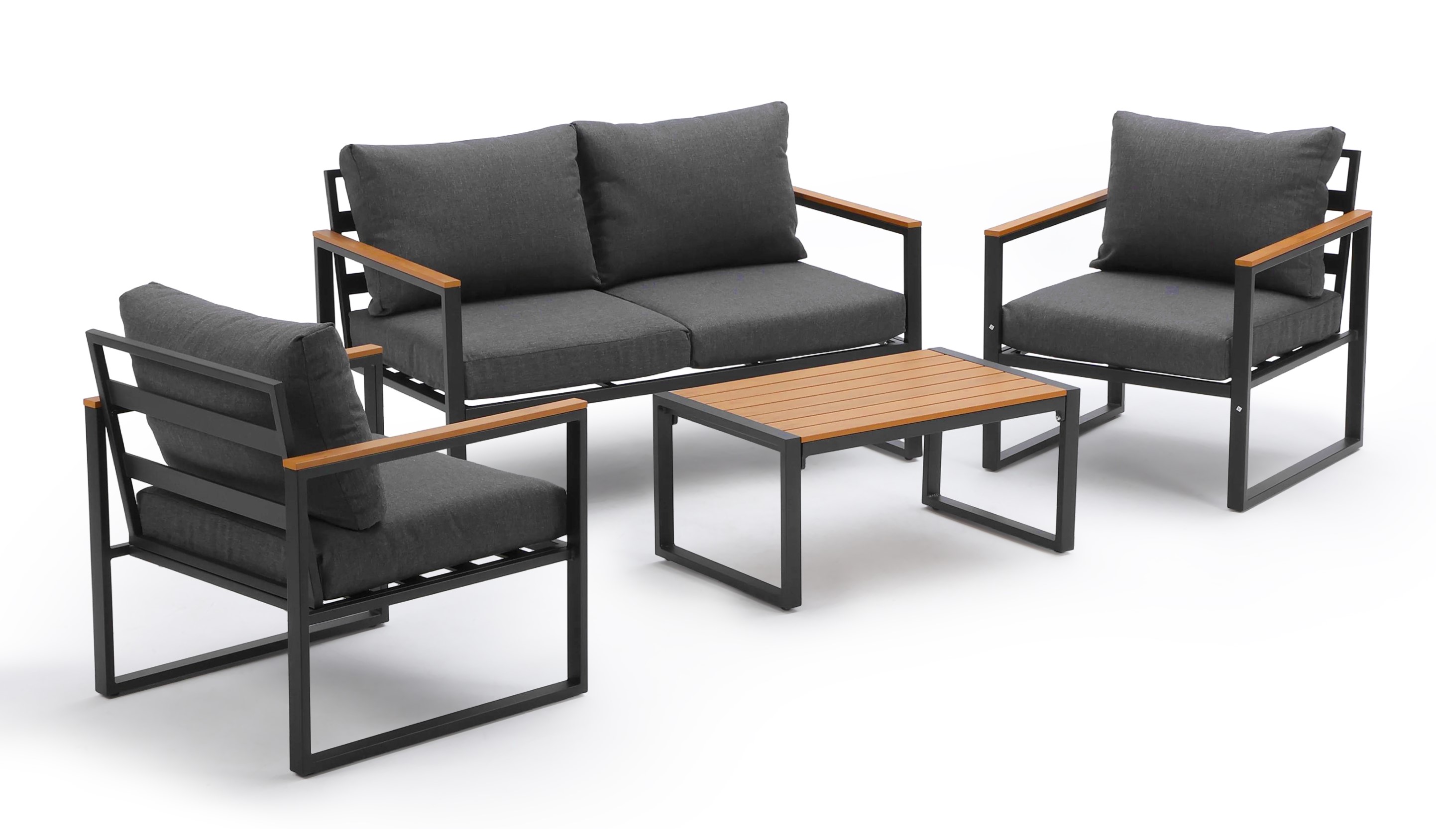 Konferenční stolek má povrch ze stejného typu umělého dřeva artwood jako područky křesel. Artwood je téměř bezúdržbový, dlouho vydrží a spolu s ocelí vypadá moderně a vkusně. Sada je primárně určena pro zahradu, ale může být umístěna i uvnitř.