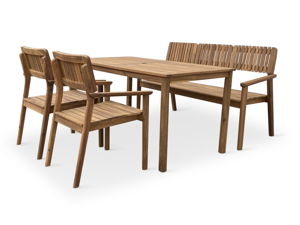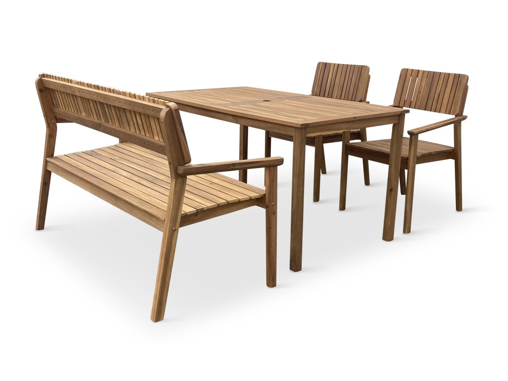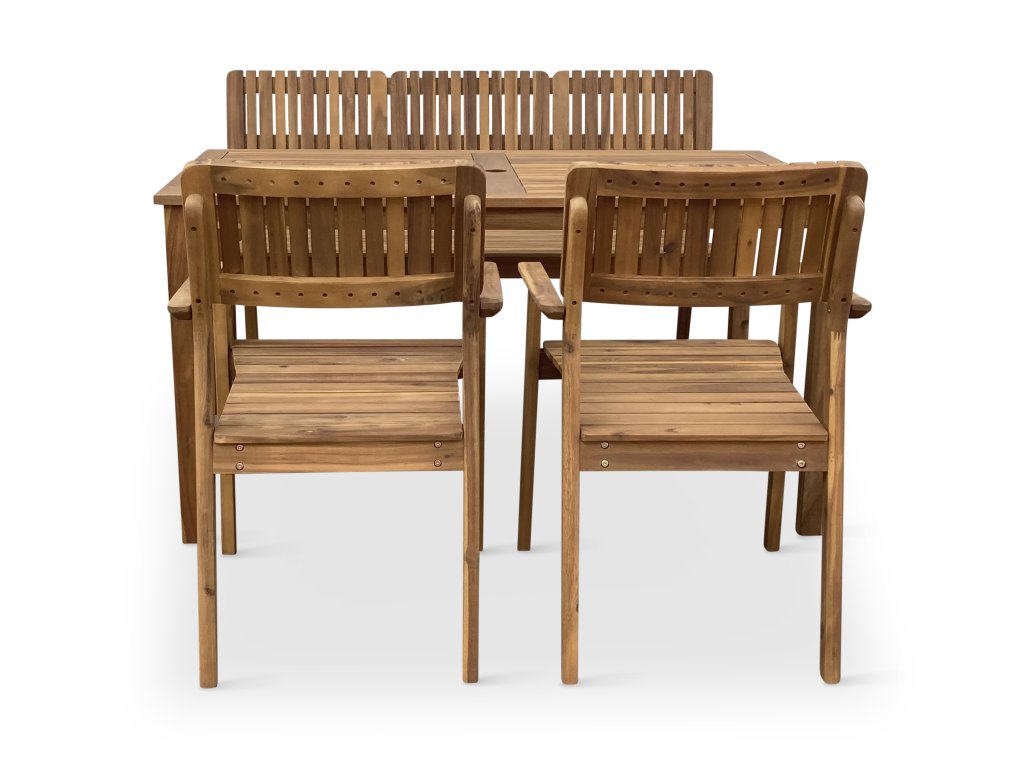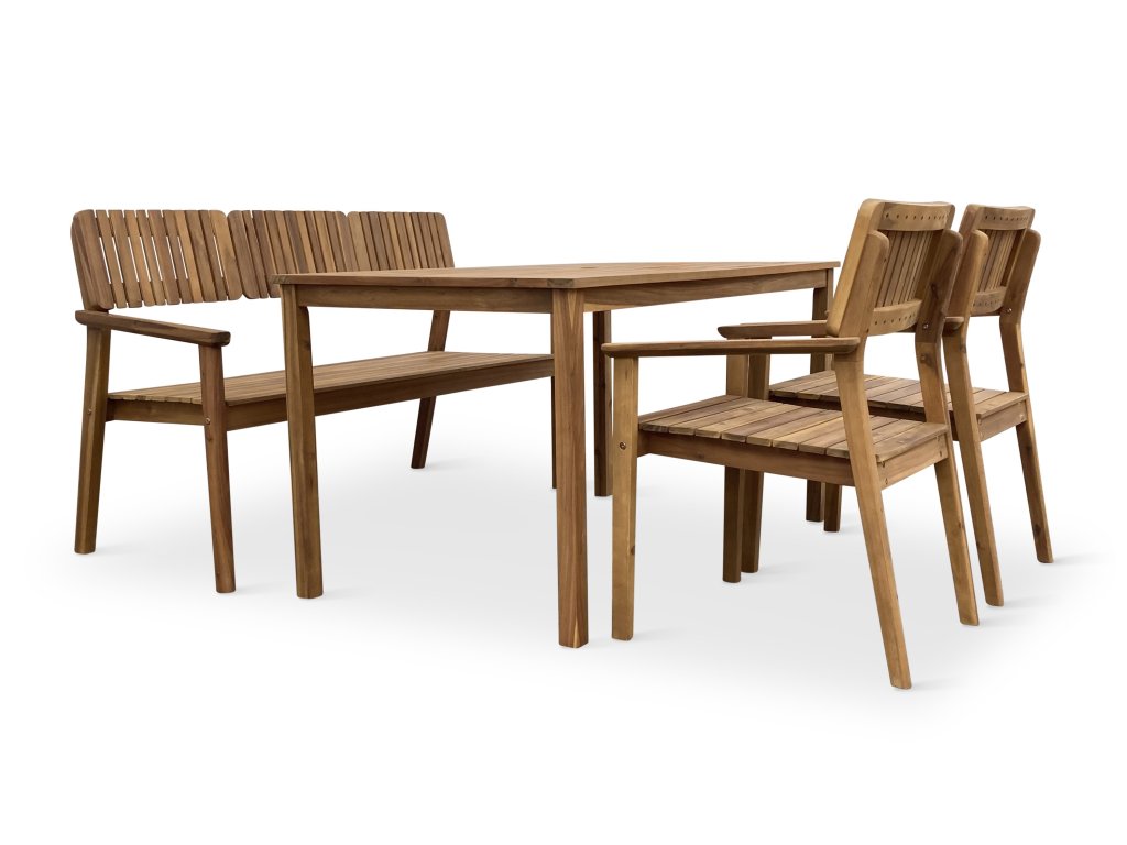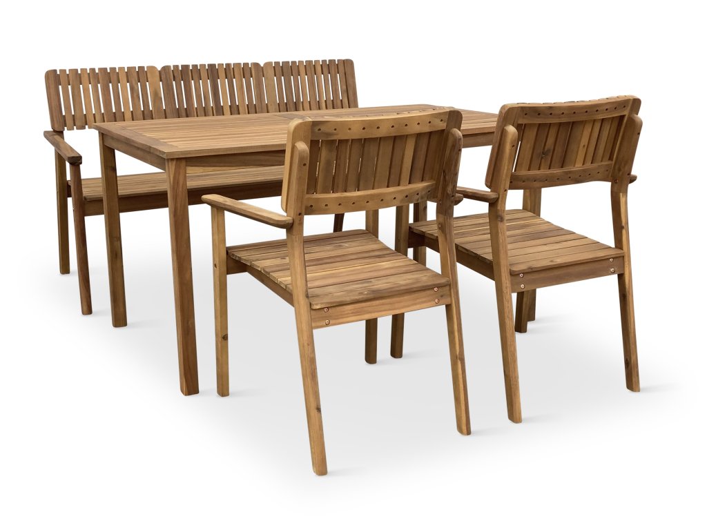 Krásná zahradní jídelní sestava z akácie pro 5 osob. Sestavu tvoří Zahradní dřevěný stůl LUCY, 2x Zahradní stohovatelné křeslo LUCY z akácie a 1x Zahradní dřevěná lavice LUCY 3-místná.