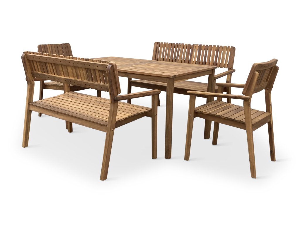 Krásná zahradní jídelní sestava z akácie pro 6 osob. Sestavu tvoří Zahradní dřevěný stůl LUCY, 2x Zahradní stohovatelné křeslo LUCY z akácie a 2x Zahradní dřevěná lavice LUCY 2-místná.