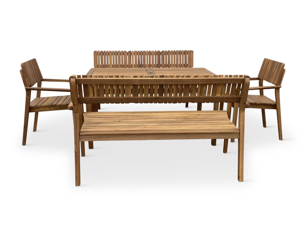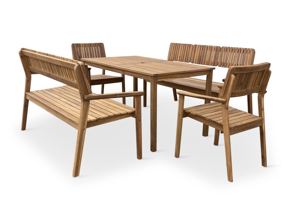 Krásná zahradní jídelní sestava z akácie pro 8 osob. Sestavu tvoří Zahradní dřevěný stůl LUCY, 2x Zahradní stohovatelné křeslo LUCY z akácie a 2x Zahradní dřevěná lavice LUCY 3-místná.