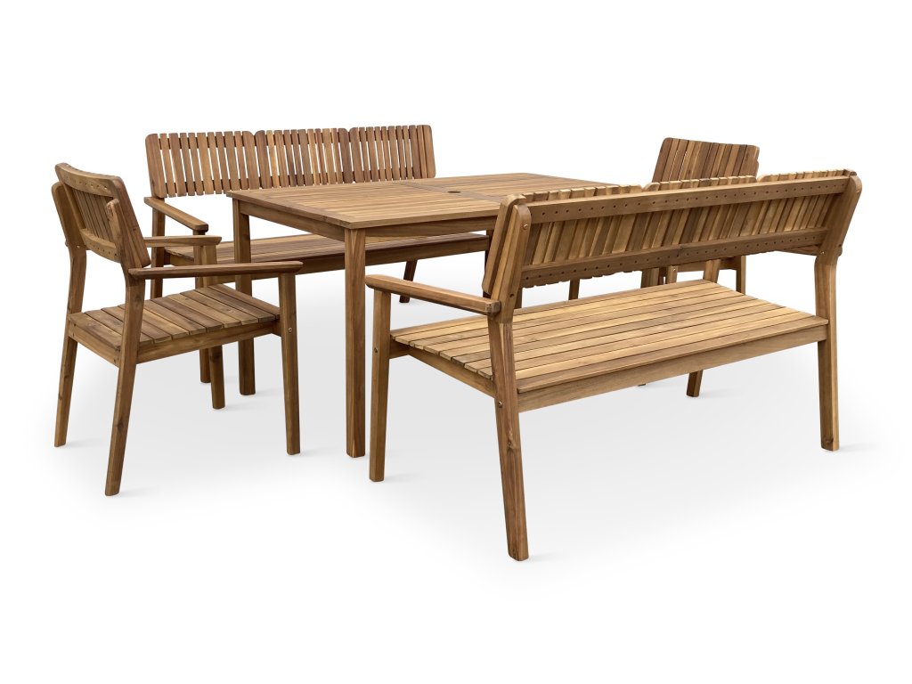 Pěkná dřevěná sestava z akácie s menším stolem, která nezabere moc místa a nabízí až 8 míst k sezení.