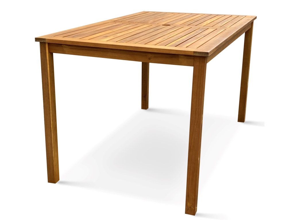 Sestava zahrnuje zahradní dřevěný stůl Lucy z akácie, který je velice vhodným řešením pro Vaši zahradu. Stůl nabízí kvalitní zpracování a klasický design s obdélníkovou deskou o rozměrech 140 cm x 80 cm. Stůl je optimální pro 6 osob. Dřevěná deska stolu v ideální výšce 74 cm disponuje praktickým otvorem pro slunečník uprostřed o průměru 5 cm. Díky nízké hmotnosti stůl snadno přenesete.