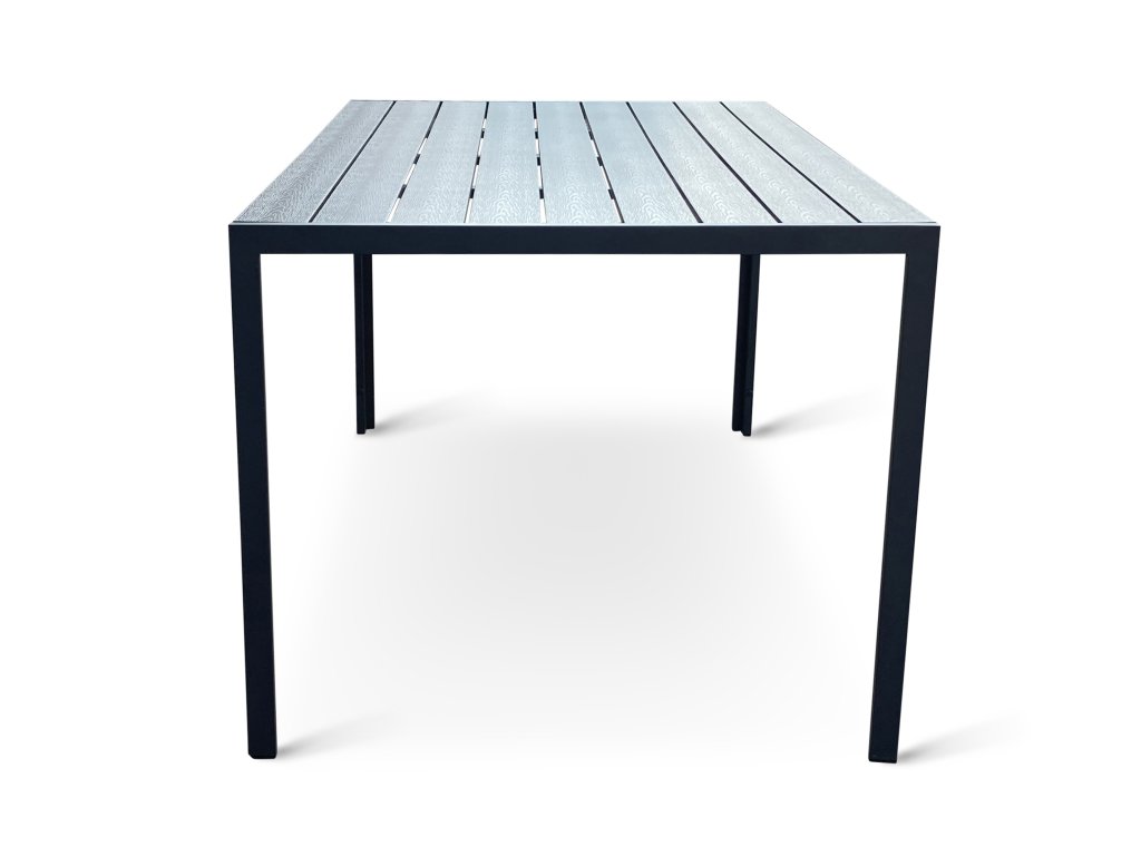 Sestava zahrnuje krásný a lehký stůl vyrobený z materiálů, které nevyžadují zvláštní údržbu. Konstrukce z hliníku ošetřeného proti rzi, deska stolu z artwoodu a adaptéry u nohou pro větší stabilitu. Umělé dřevo artwood v černé barvě věrně imituje strukturu a vzhled dřeva. Ani po několika sezónách neztratí svůj původní vzhled a stabilitu. Klasické tvary a černé provedení stolu.
