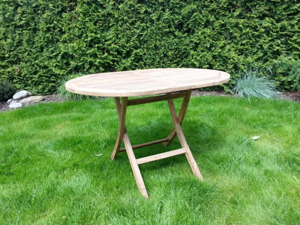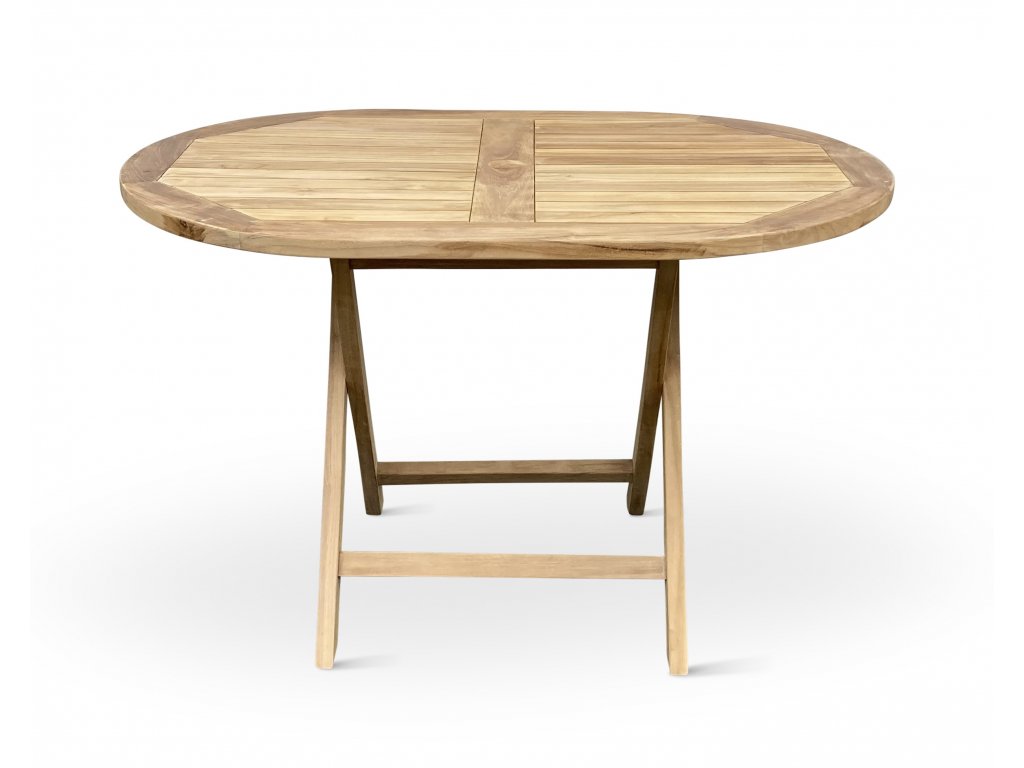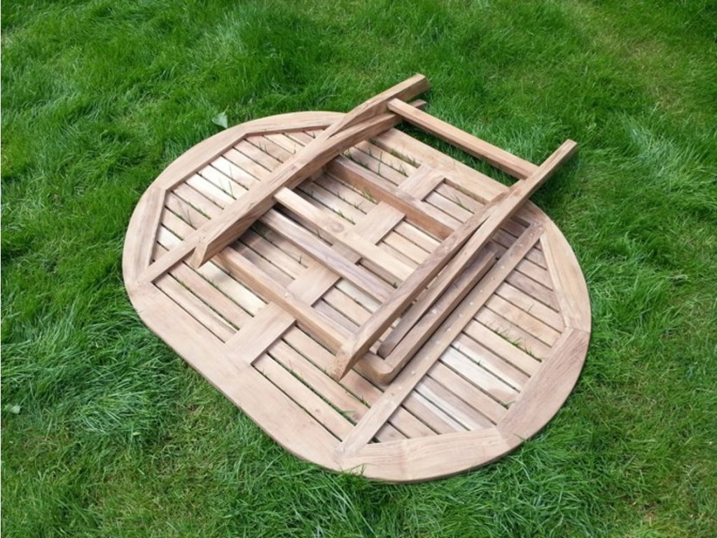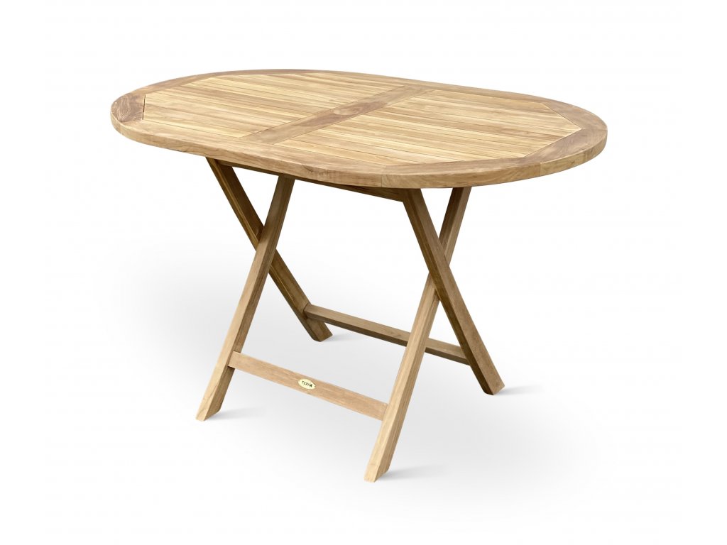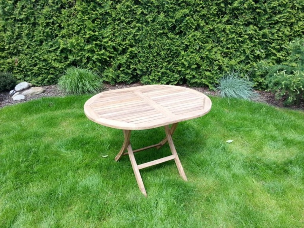 Skládací zahradní stůl z teakového dřeva. Oválná deska stolu s otvorem pro slunečník uprostřed nabízí dostatek místa až pro 4 osoby. Možnost složení stolu oceníte zejména při uskladnění po sezóně. Vhodný do menších prostor jako jsou menší zahrady nebo terasy.