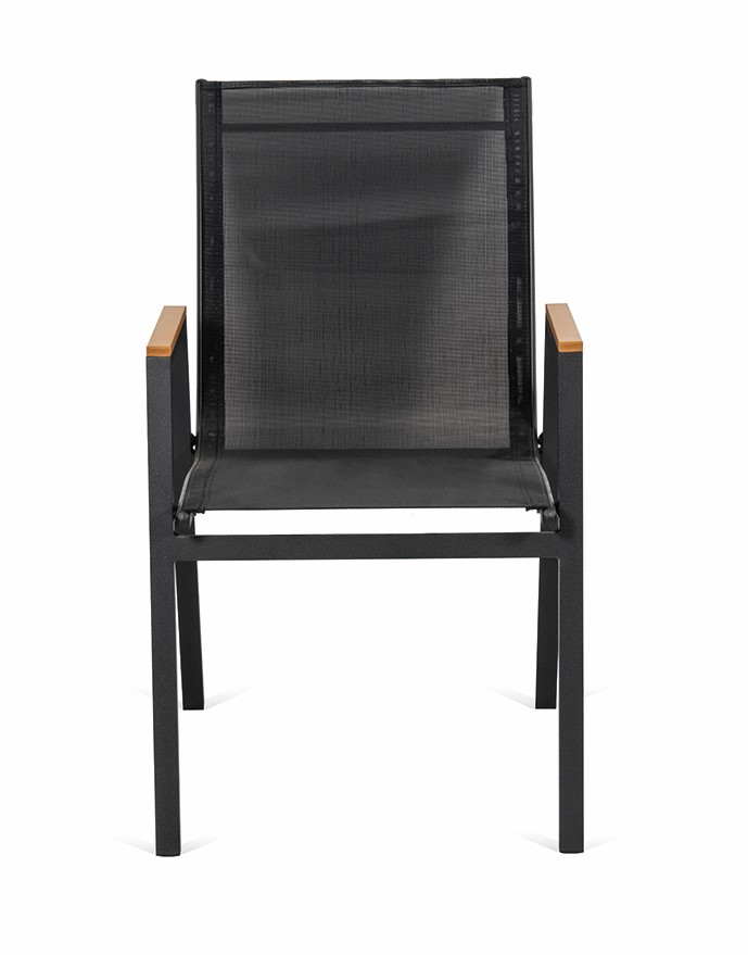 Stohovatelná zahradní židle s pevnou hliníkovou konstrukcí. Pohodlná vzdušná textilie, ze které je vyroben sedák, je ideální na léto. Všechny použité materiály jsou nenáročné na údržbu. Zásluhou nízké hmotnosti je manipulace s židlemi velmi snadná. Stohovatelný design židle oceníte zejména při uskladnění po sezóně. Židle jednoduše naskládáte na sebe a nezaberou vám mnoho místa. Všechny tyto vlastnosti dělají z židle OSLO velmi praktickou a oblíbenou zahradní židli. Díky atraktivní barevné kombinaci černé židle s hnědými područkami z artwoodu bude židle vypadat skvěle na jakékoliv zahradě či terase. Židle OSLO využijete stejně dobře v exteriéru i interiéru.